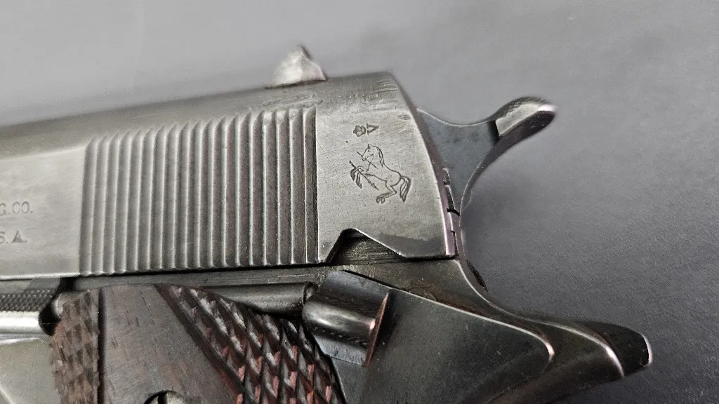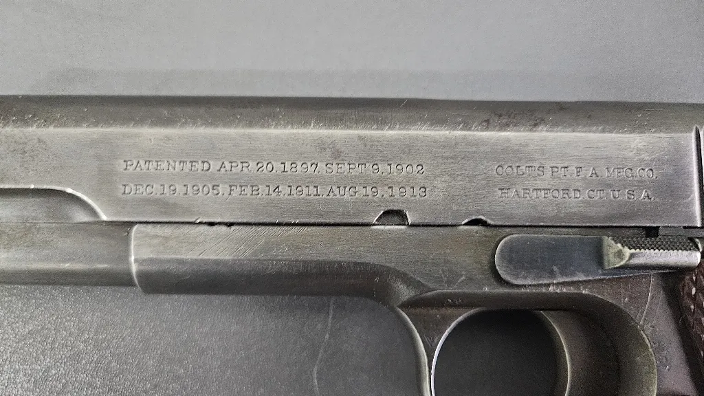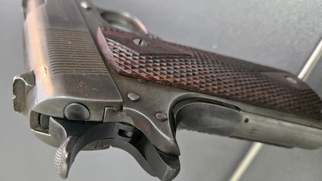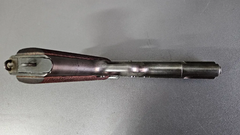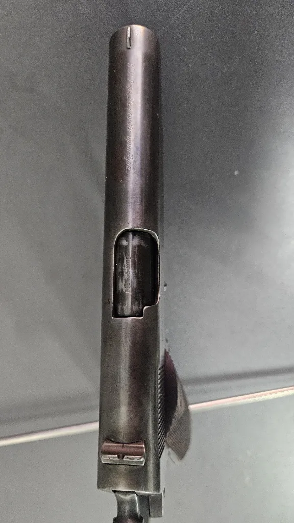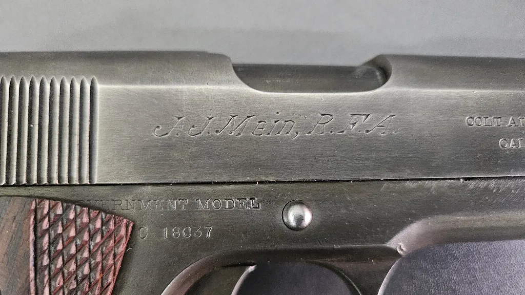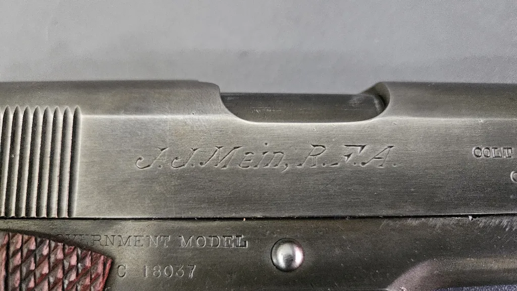 COLT M1911 komercyjny, rok 1915 Egzemplarz o wyjątkowej historii, sprzedany przez rusznikarnię Williama Rochester Pape'a w Newcastle upon Tyne brytyjskiemu oficerowi Royal Field Artillery, J.J.Meinowi. Oficer prawdopodobnie przeżył Wielką Wojnę, jego nazwisko nie figuruje w spisach poległych. Oryginalne wykończenie i okładziny nie zachowały się, lufa powojenna bardzo ładna. Pistolet sprawny technicznie. Jego największa wartość to historia zapisana na metalu, świadectwo czasów i losów, które warto dalej odkrywać.