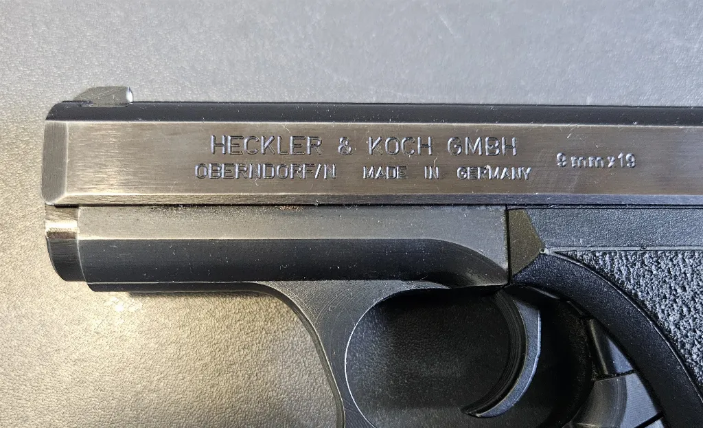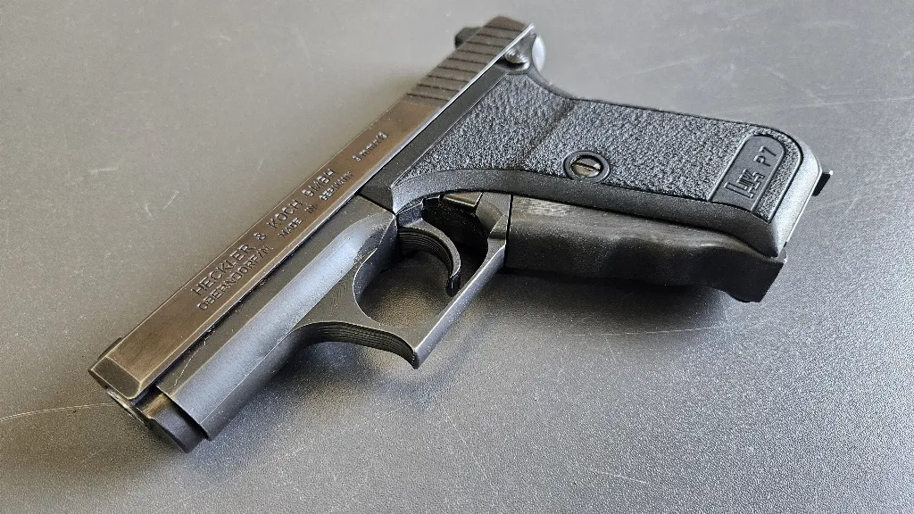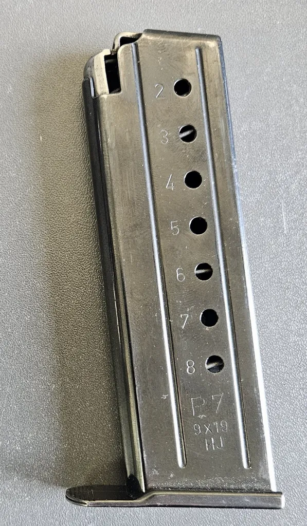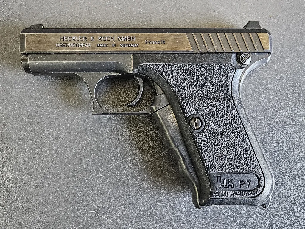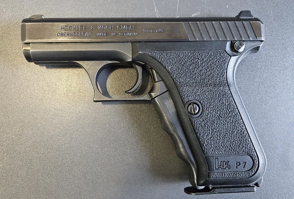 Pistolet Heckler&Koch P7. Pistolet z 1982 roku, czyli z wczesnej produkcji tego modelu. Broń w bardzo dobrym stanie, nie jest to jeden z ex-policyjnych wymęczonych niemieckich pistoletów, ten egzemplarz został wyprodukowany na rynek cywilny i raczej leżał w szafie niż strzelał. Przewód lufy w stanie idealnym.