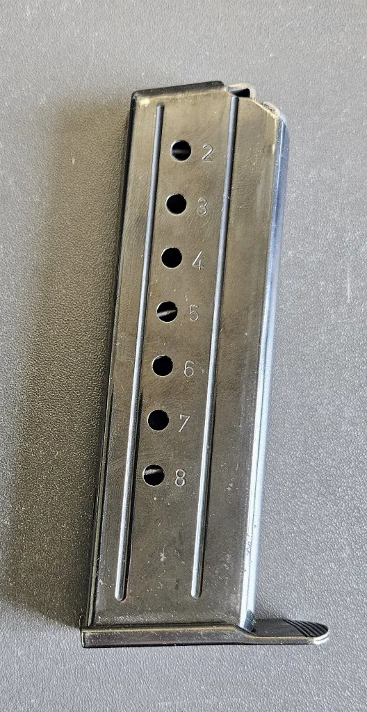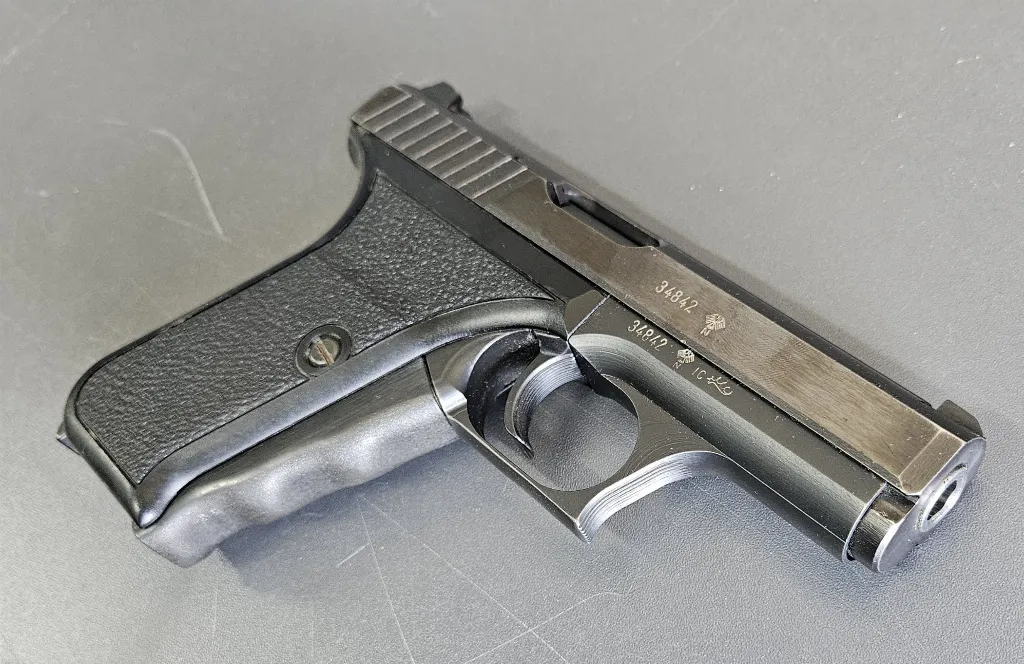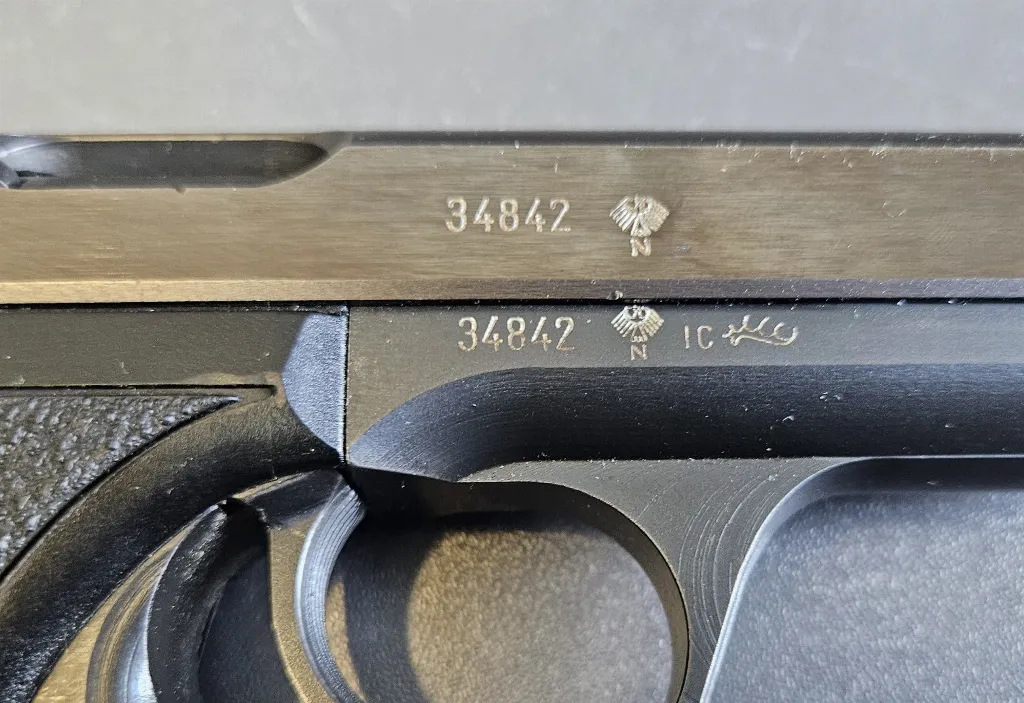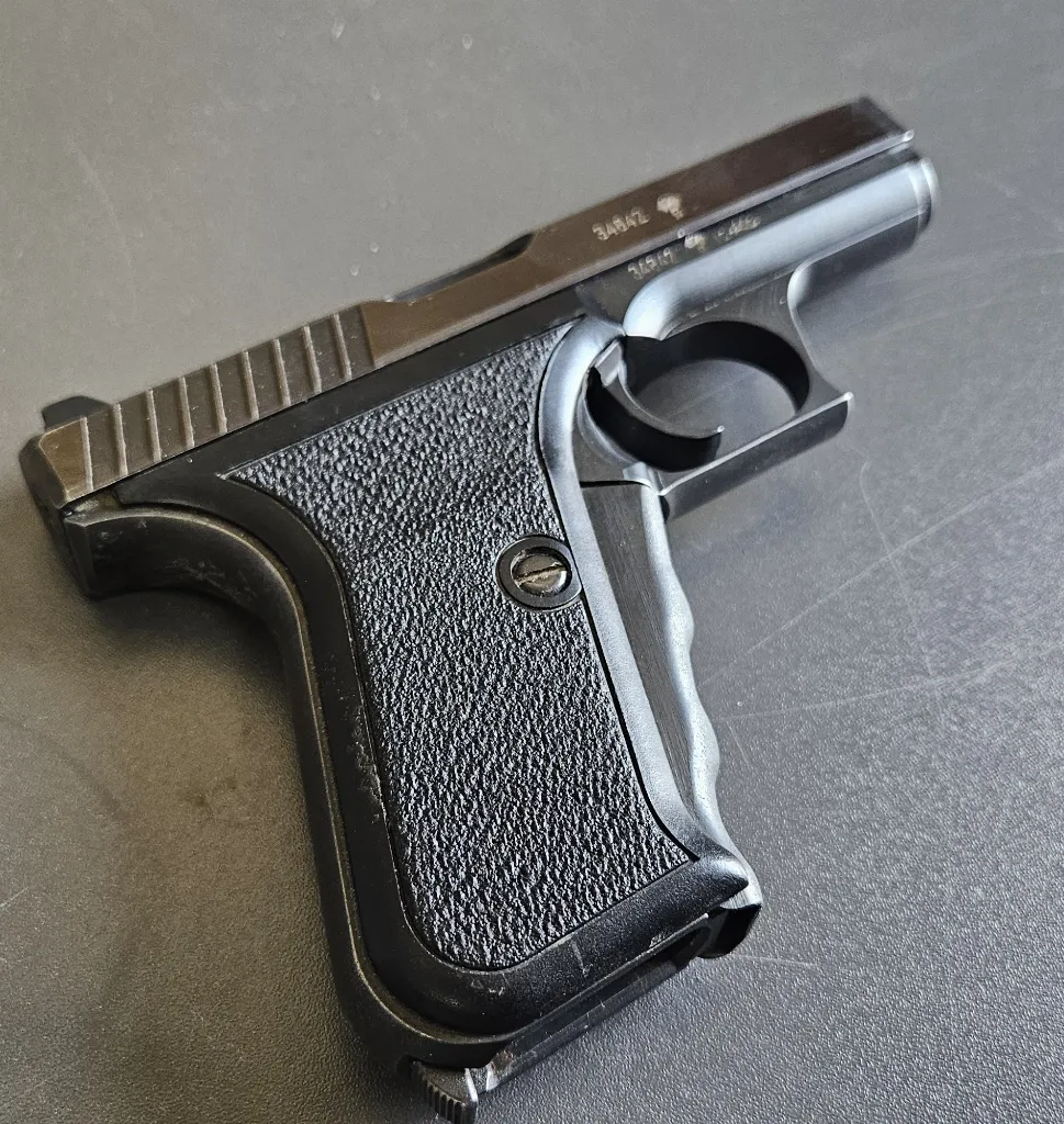 Pistolet Heckler&Koch P7. Pistolet z 1982 roku, czyli z wczesnej produkcji tego modelu. Broń w bardzo dobrym stanie, nie jest to jeden z ex-policyjnych wymęczonych niemieckich pistoletów, ten egzemplarz został wyprodukowany na rynek cywilny i raczej leżał w szafie niż strzelał. Przewód lufy w stanie idealnym.