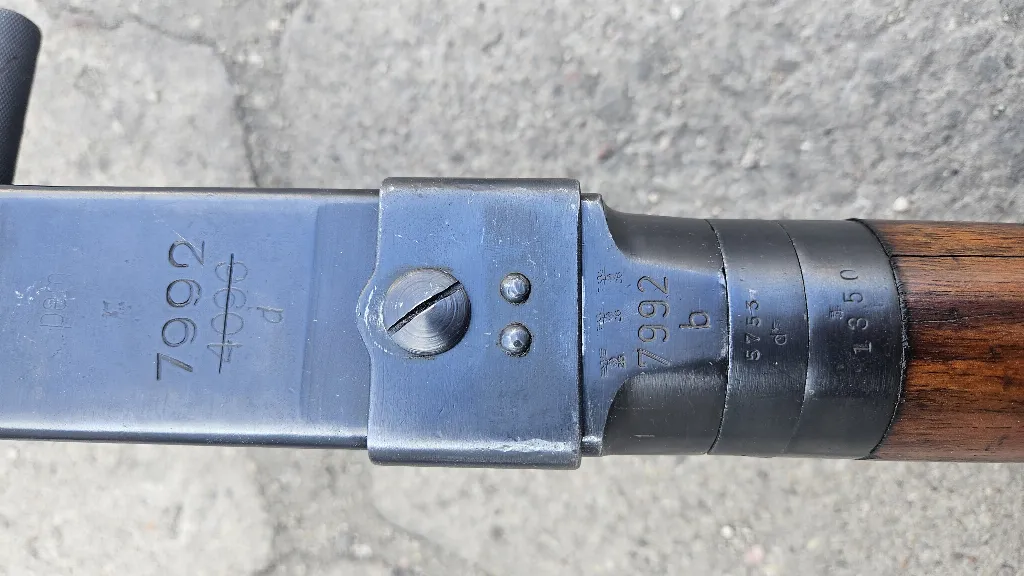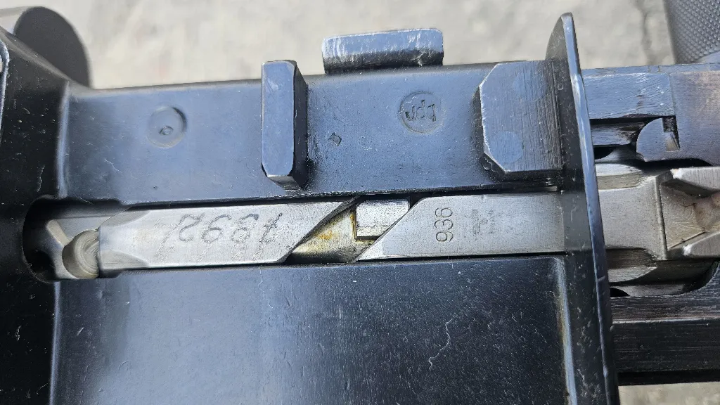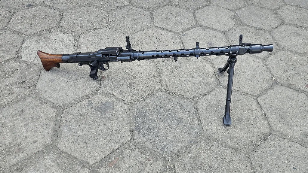 uniwersalny karabin maszynowy MG34 wyprodukowany w zakładach Mauser-Werke Borsigwalde w 1940 roku. Broń w bardzo dobrym stanie, większość głównych części zgodna, klapa uzgodniona numerowo, karabin przeszedł remont wojskowy, prawdopodobnie w Norwegii. Technicznie i mechanicznie wszystko w pełni sprawne, w stanie magazynowym. Przewód lufy w stanie fabrycznym.